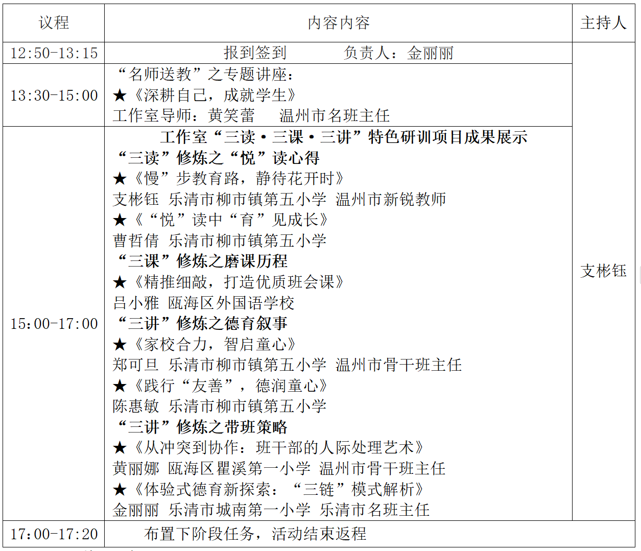 为贯彻《教育部关于进一步加强中小学班主任工作的意见》文件精神,为发挥名师的示范辐射作用,加快班主任队伍建设,提高班主任专业素养,现决定举行第三期温州市黄笑蕾名班主任工作室“名师送教”活动暨第24次集训之“三读·三课·三讲”项目研修成果展示。现将有关事项通知如下: